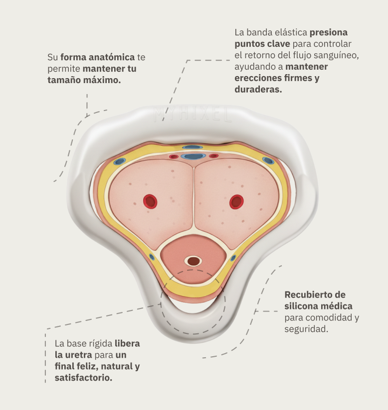 MYHIXEL Ring ha sido desarrollado en colaboración con urólogos y profesionales de la salud sexual masculina para abordar la pérdida y mantenimiento de la erección. Su diseño aplica presión en puntos específicos y permite que la uretra quede libre, lo cual es esencial para que la eyaculación sea cómoda y placentera.