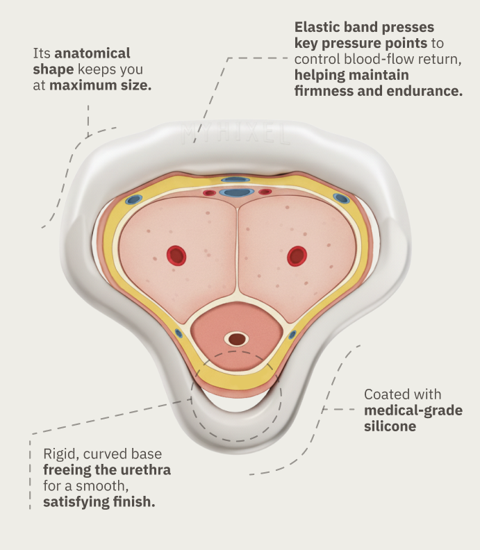 The MYHIXEL Ring has been designed in collaboration with urologists and experts in male sexual health to address the loss and maintenance of an erection. Its design applies pressure to specific points while keeping the urethra free, which is essential for a comfortable and pleasurable ejaculation.