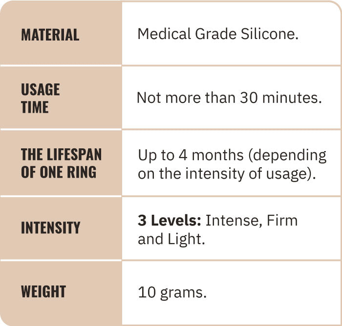 MYHIXEL Ring fits all sizes, but we know everyone has their own needs and preferences. That's why we offer three different pressure levels. To achieve the desired sensation, each ring has an elastic band ranging from the most flexible (LIGHT), medium (FIRM), and least elastic (INTENSE).