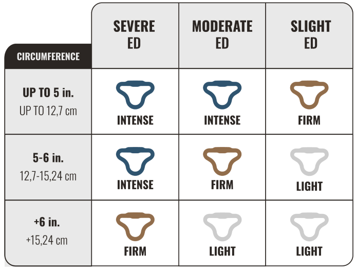 In any case, we have created the following chart where we recommend our ring models based on the circumference of your penis (partially or fully erected) and the level of ED or lack of erection: